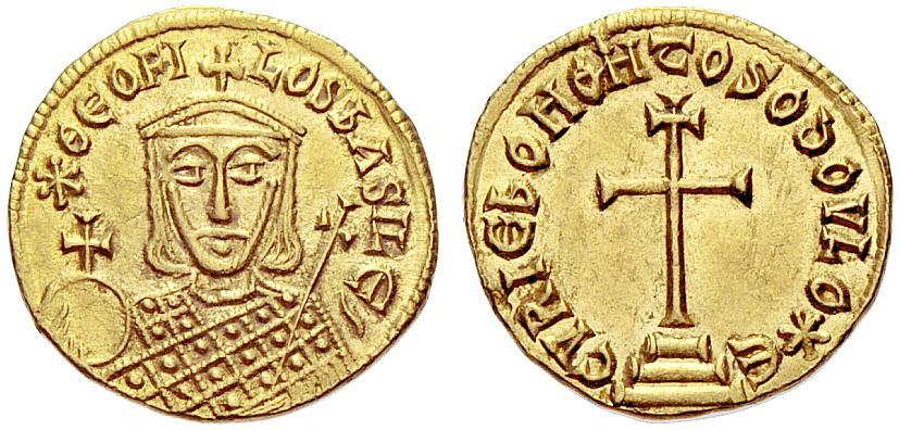 The Byzantine Empire. Theophilus, 829 – 842, with colleagues from 830. Solidus 829-830/1, AV 4.49 g. QQEOFI – LOS bASILES Facing bust, with short beard, wearing loros and crown, holding globus cruciger and cruciform sceptre. Rev. CVRIE bOHQH tO SO dOVLOQE Patriarchal cross on three steps. DO 1a. Sear 1655. Rare. Good extremely fine. Ex Goldberg sale 26 May 2009, Christov, 2238.