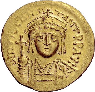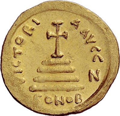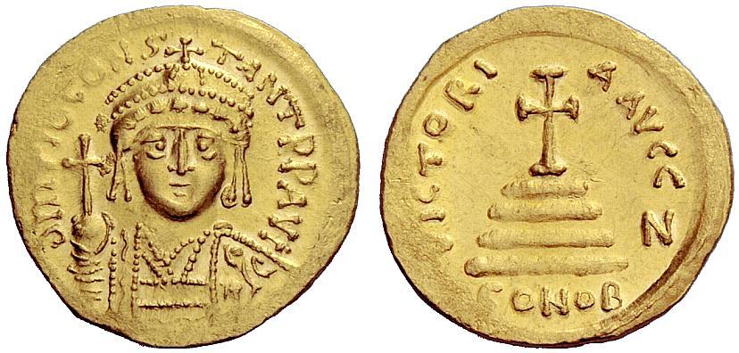 The Byzantine Empire, Tiberius II Constantine, 578 – 582, Solidus 579-582, AV 4.47 g. d M TIb CONS – TANT P P AVG Crowned and cuirassed bust facing, holding globus cruciger and shield decorated with horseman-enemy motif. Rev. VICTORI – A AVGG Z Cross potent on four steps; in exergue, CONOB. DO 4g. MIB 4. Sear 422. Extremely fine