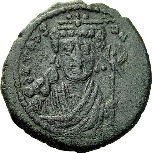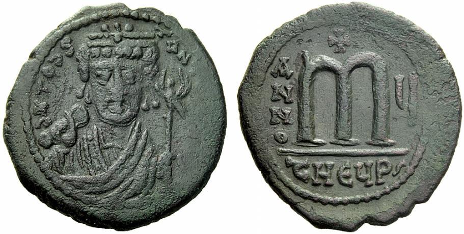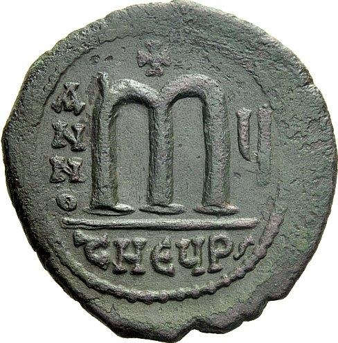 The Byzantine Empire. Tiberius II Constantine, 578 – 582. Follis, Antiochia year 5, 580, Æ 14.34 g. d ¦ TOÉS – TANT [PP AVI] Cuirassed bust facing, wearing consular robes and crown surmounted by trefoil, holding mappa and eagle-tipped sceptre. Rev. Large M between A / N / N / O – ¢; above, cross and in exergue, tHEYPs. DO 41 var. (cross on crown). MIB 47a var. (cross on crown). Sear 448. Dark green patina and very fine / good very fine