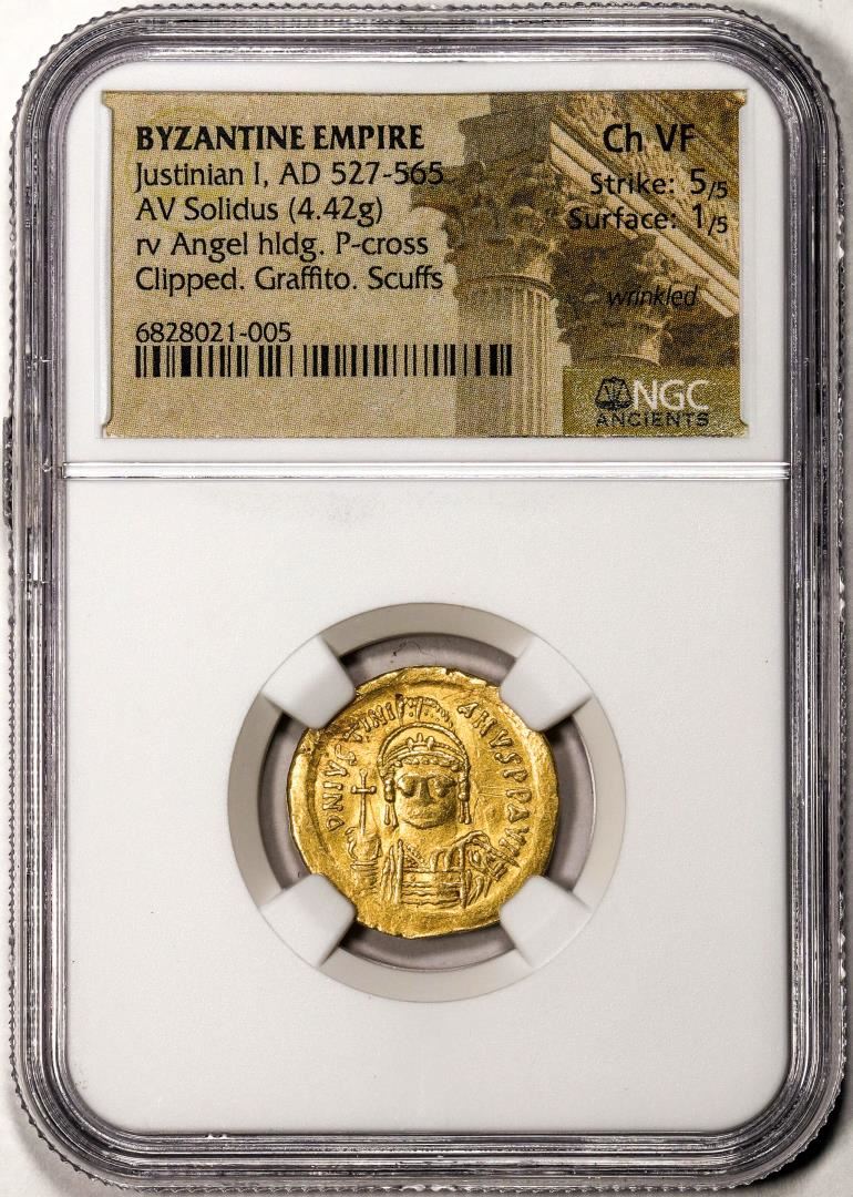 Byzantine Empire 527-565 AD Justinian I AV Solidus Ancient Gold Coin NGC Ch VF