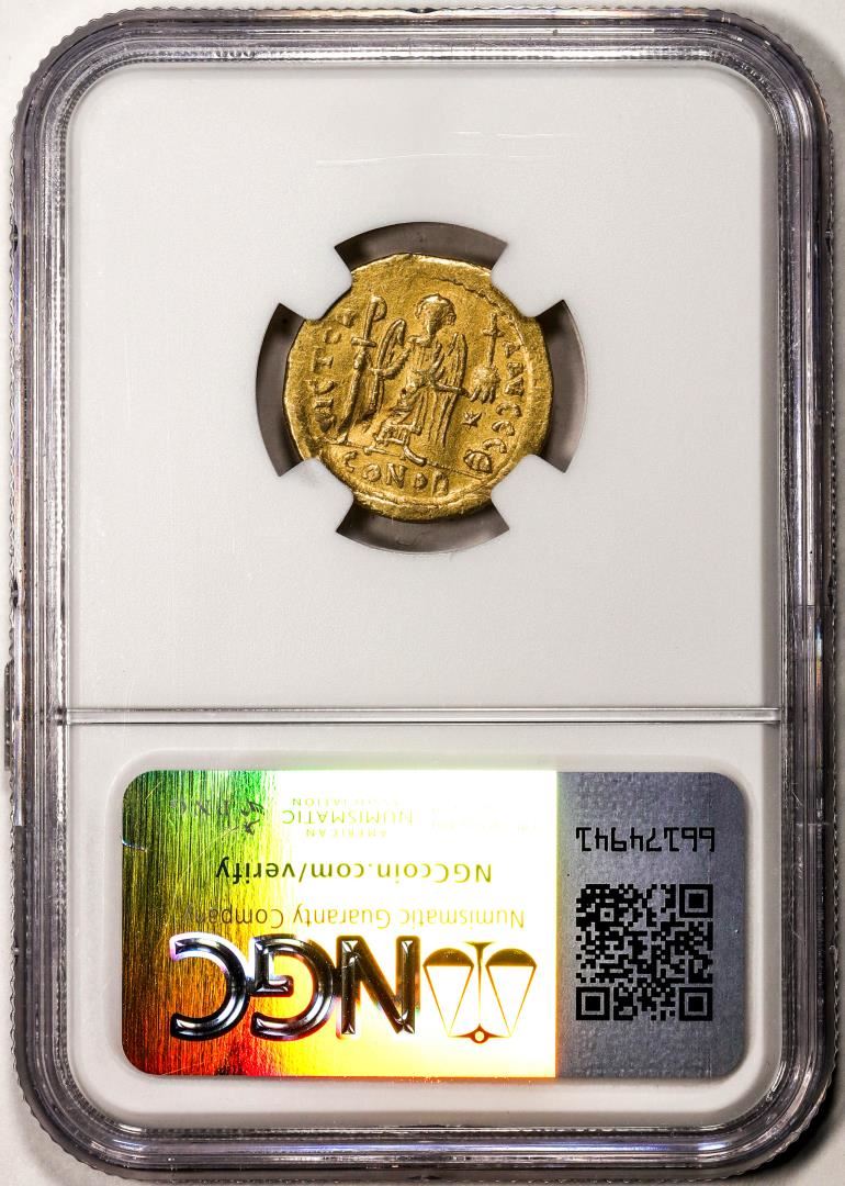 One Byzantine Empire 527-565 AD Justinian I AV Solidus Ancient Gold Coin NGC Ch VF. NGC Certified.