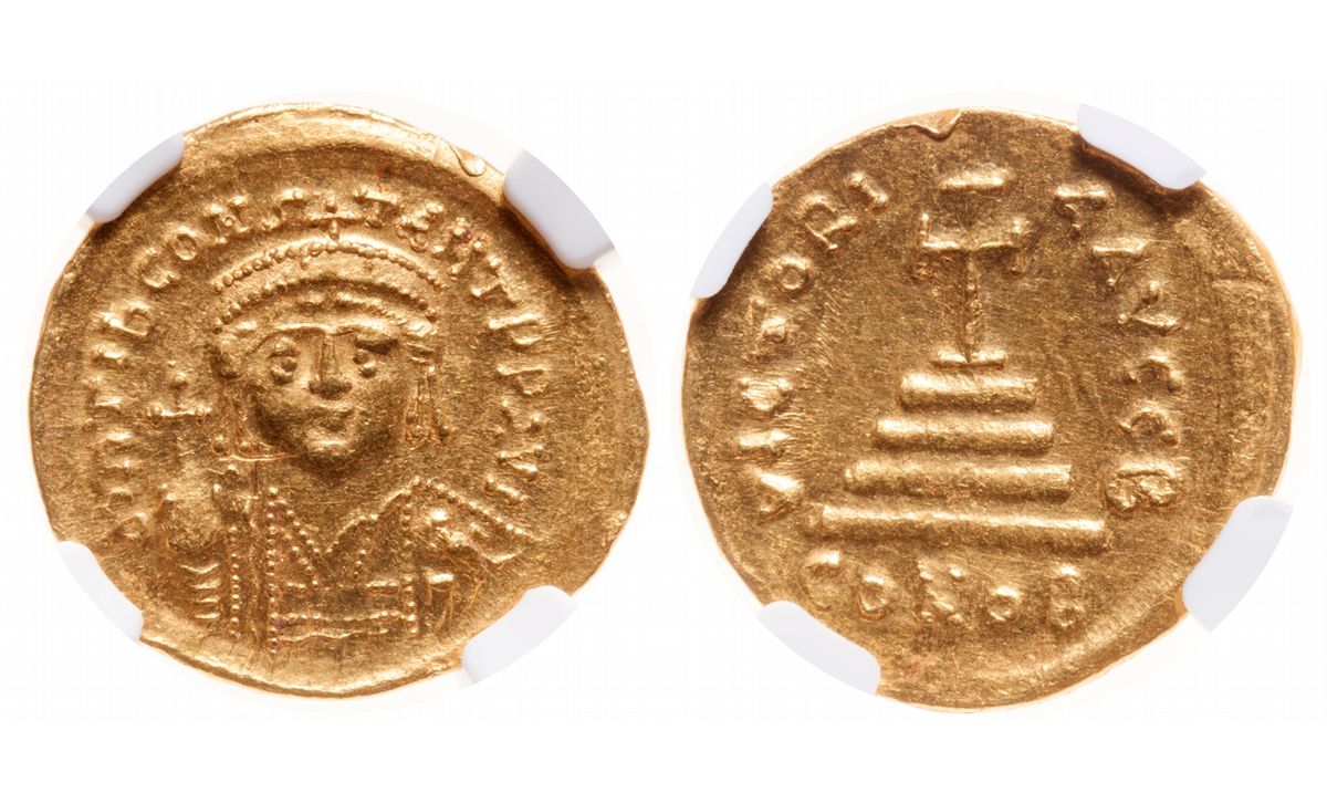 Byzantine Empire. Gold Solidus. AD 578-582. Tiberius II Constantine; Facing Bust / Cross Potent on Steps. NGC graded Mint State; Strike: 5/5, Surface: 4/5. 4.45g.