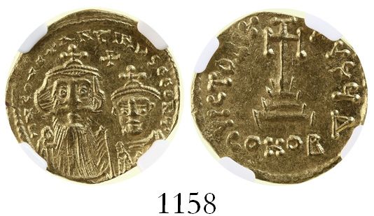 Byzantine Empire, AV solidus, Constans II and Constantine IV, 654-668 AD, encapsulated NGC Ch AU strike 5/5 surface 3/5. Sear 749. Facing bust of Constant II with long beard on left and Constantine IV, beardless on right / Cross potent on four steps; in exergue, CONOB.