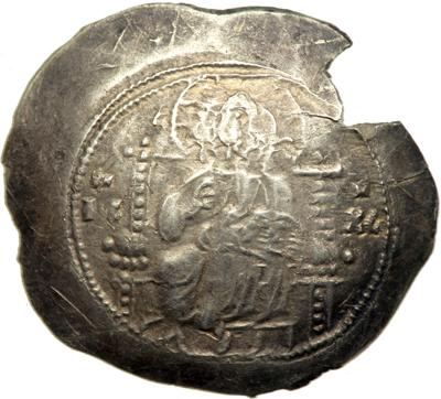 Byzantine Empire. Alexius I, 1081-1118 (Pre-Reform Coinage, 1081-1092). Histamenon Nomisma (electrum or silver, flan. chipped (4.10g) 1082-7. Christ, wearing nimbus cr., seated facing on square-backed throne, holding book of Gospels, double border. Rev. Crowned bust of Alexius facing, wearing jeweled chlamys and holding gl. cr. in l. hand and sceptre with pellet on shaft and surmounted by star ornament in r., double border. DOC 2b; Hendy pl. 1, 4; Sear 1893. Good very fine and rare, toned, edge chipped at 4-5 o'clock.
