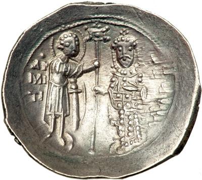 Byzantine Empire. Alexius I, 1081-1118 (Pre-Reform Coinage, 1081-1092). Histamenon Nomisma (electrum or silver, 4.38g). Thessalonica 1081-2. Bust of Christ facing, wearing nimbus cr. and holding book of Gospels, double border. Rev. St. Demetrius, nimbate, stg. three-quarter face to r., holding sword and presenting labarum to Alexius who stands facing on r., wearing crown and loros, double border. DOC 4; Hendy pl. 1, 9; Sear 1904. Extremely Fine and extremely rare.