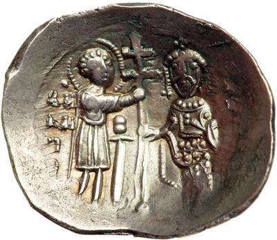 Byzantine Empire. Alexius I, 1081-1118 (Pre-Reform Coinage, 1081-1092). Histamenon Nomisma (electrum or silver, 4.39g). Thessalonica 1082-7. Similar to previous, but instead of labarum St. Demetrius presents to the emperor a patriarchal cross resting on globus and two steps. DOC 5a; Hendy pl. 1, 10-12; Sear 1905. Good Very Fine and very rare, obverse a little weakly struck.