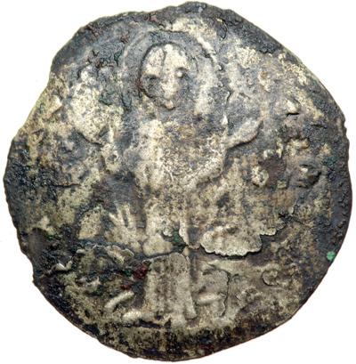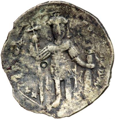 Byzantine Empire. Alexius I, 1081-1118 (Pre-Reform Coinage, 1081-1092). Miliaresion (billon, concave fabric, 1.88g). Constantinople The Virgin stg. facing on footstool, nimbate and with her hands uplifted (orans), inscription around "May the Mother of God help your servant". Rev. Alexius, crowned and wearing military attire, stg. facing, holding long cross and resting on hilt of sheathed sword, dot below his r. elbow. DOC 10; Hendy pl. 2, 13; Sear 1897. Fair to Fine and very rare.