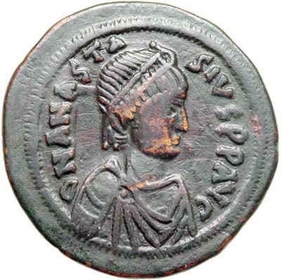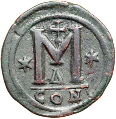 Byzantine Empire. Anastasius I, 491-518. follis or 40 nummi (19.93g), Constantinople, 4th officina, 512-17. Diad. bust r. Rev. Large M between two stars. DOC 23f; MIB 27; Sear 19. A handsome good Very Fine with green-brown patina.