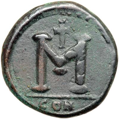 Byzantine Empire. Anastasius I, 491-518. follis or 40 nummi (8.55g), Constantinople, 498-507. Diad. bust r. Rev. Large M, cross above, cross in ex. DOC 16; MIB 22; Sear 14. An attractive Very Fine with dark brown patina, traces of an undertype on reverse.