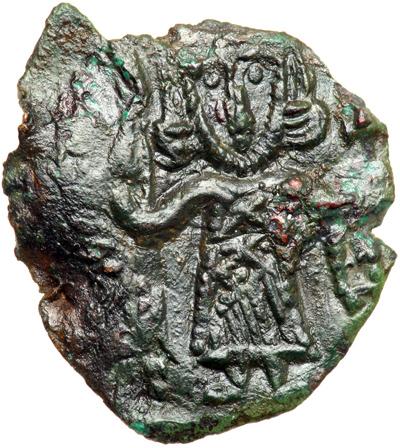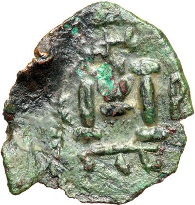 Byzantine Empire. Anastasius II, 713-715. follis or 40 nummi (1.77g), Syracuse. Anastasius stg. facing, wearing crown and loros and holding spear and gl. cr. Rev. Large M between C-P, monogram of Anastasius above, SCL in ex. DOC -; MIB 33; Spahr 291; Sear 1475. Almost Extremely Fine/very fine with dark patina and very rare, irregular flan.