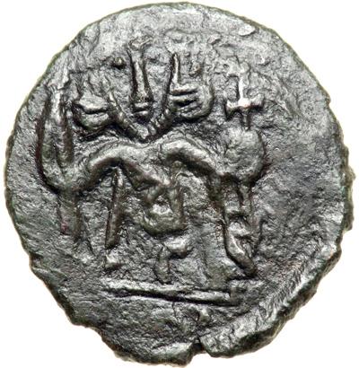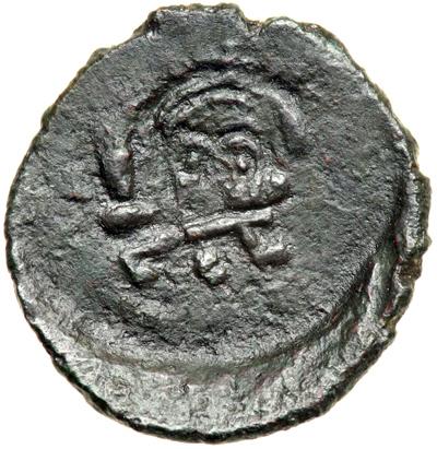 Byzantine Empire. Anastasius II, 713-715. follis or 40 nummi (3.5g), Syracuse. Anastasius stg. facing, wearing crown and loros and holding scepter or spear and gl. cr. Rev. Large M between [C-P, monogram of Anastasius above], SCL in ex. DOC -; MIB 33; Spahr 291; Sear 1475. Good very fine with dark patina and very rare; overstruck, possibly on the initial issue of the same reign (crowned facing bust clearly visible on reverse).