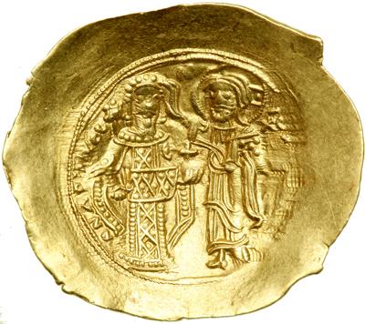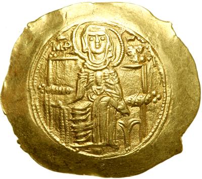 Byzantine Empire. Andronicus I, 1183-1185. Gold Hyperpyron Nomisma (4.23g), Constantinople. The Virgin, nimbate, seated facing on square-backed throne, holding before her circular medallion with the bust of the infant Christ. Rev. Facing stg. figures of Andronicus, with forked beard, on l., and Christ, with nimbus cr., on r., the emperor wearing divitision, loros, and sagion and holding labarum and gl. cr., Christ crowning the emperor with r. hand and holding book of Gospels in l. DOC 1; Hendy pl. 18, 9-10; Sear 1983. Extremely Fine and rare, an exceptional example of the much sought-after gold coinage of this brief reign.
