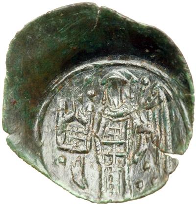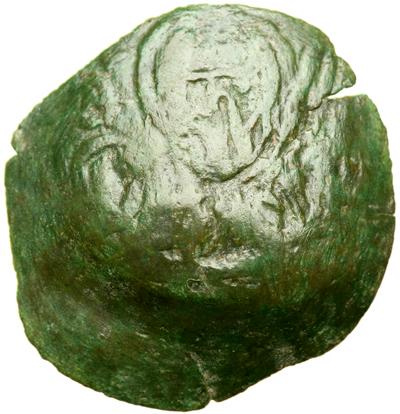 Byzantine Empire. Andronicus II, 1282-1328. Bronze Trachy Nomisma (1.21g), Thessalonica. Half-length figure of St. Demetrius facing, nimbate and in military attire, holding spear over l. shoulder, large B in field to l. Rev. Winged figure of Andronicus stg. facing, crowned and wearing loros, holding model of the city of Thessalonica in r. hand and scepter in l. DOC 849-51 (Class XLIV); PCPC 255; LPC p. 210, 11; Sear-Bendall 2370. Fine/very fine, rare and interesting.
