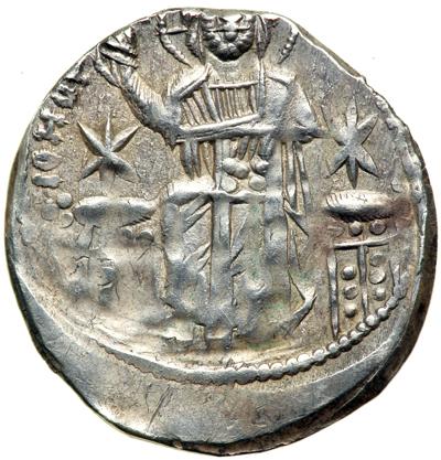 Byzantine Empire. Andronicus II and Michael IX, 1295-1320. Silver Basilikon (1.93g), Constantinople. 1304-20. Christ seated facing on backless throne, wearing nimbus cr., his r. hand raised in benediction, holding book of Gospels in l., stars in field to l. and to r. Rev. Crowned figures of Andronicus, bearded, on l., and Michael, beardless, on r., each wearing loros and with one hand on chest, holding labarum between them. DOC 535-8; PCPC 167; LPC p. 88, 35; Sear-Bendall 2402. Nearly Very Fine/very fine.
