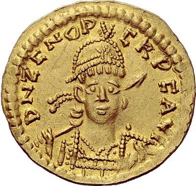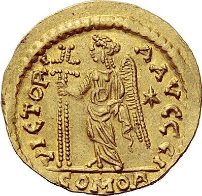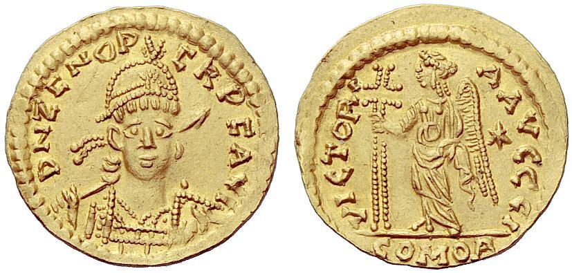 The Byzantine Empire. Barbaric coinages imitating Imperial issues. In the name of Zeno, 474-491. Solidus, Western european mint (?), AV 4.38g. Pearl-diademed, helmeted and cuirassed bust facing three-quarters r., holding spear and shield; in r. field star. Rev. Victory standing l., holding long jewelled cross. Lacam, FIN –. RIC –. Metlich –. MEC –. Apparently unrecorded. Extremely fine