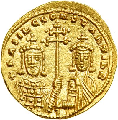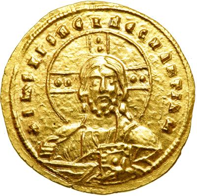 Byzantine Empire. Basil II and Constantine VIII, 976-1025. Gold Histamenon Nomisma (4.4g), Constantinople. 977. Bust of Christ facing, wearing nimbus cr. and holding book of Gospels. Rev. Facing crowned busts of Basil, bearded and wearing loros, on l., and Constantine, beardless and wearing chlamys, on r., holding patriarchal cross between them. DOC 1 = Montagu 1235; BNP 2; Sear 1795. Choice Extremely Fine and rare.