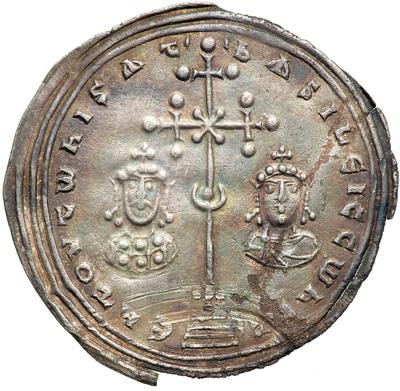 Byzantine Empire. Basil II and Constantine VIII, 976-1025. Silver Miliaresion (2.6g), Constantinople. 989-1025. Another, similar to previous, but on larger and thinner flan. DOC 20; Sear 1812. Good very fine, but minor edge chipping and with scratches and some surface erosion on both sides.