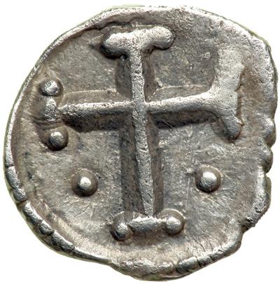 Byzantine Empire. Constans II, 641-668. AR third Siliqua (0.57g), Carthage. 641-7. Beardless bust facing, wearing crown and chlamys and holding gl. cr. Rev. Cross potent between two pellets. DOC 131; MIB 156; Sear 1049. Very Fine and scarce.