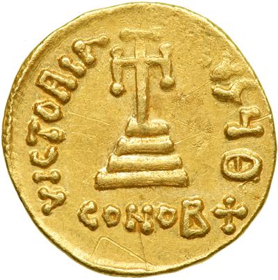 Byzantine Empire. Constans II, 641-668. Gold Solidus (4.48g), Constantinople, 9th officina. 651-4. Similar to previous, but with cross following CONOB and the rev. legend ends AVGU theta. DOC 21c; MIB 24; Sear 958. Very Fine and scarce.