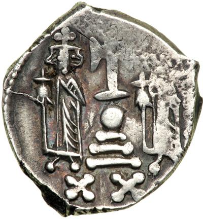 Byzantine Empire. Constantine IV With Heraclius and Tiberius, 668-685. Silver Hexagram (5.99g), Constantinople. 674-81. Another, all as previous, but with XX (= twenty folles?) beneath the steps on rev. DOC 27; MIB 68; Sear 1171. Nearly Very Fine and very scarce, but weakly struck.