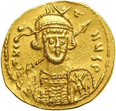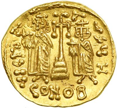 Byzantine Empire. Constantine IV with Heraclius and Tiberius, 668-685. Gold Solidus (4.29g) Constantinople, 8th officina. 674-81. Similar to previous, but the rev. legend ends AVGU H. DOC 8d; MIB 7a; Sear 1154. Good very fine, slight double-striking and some edge clipping.