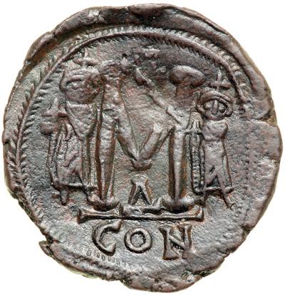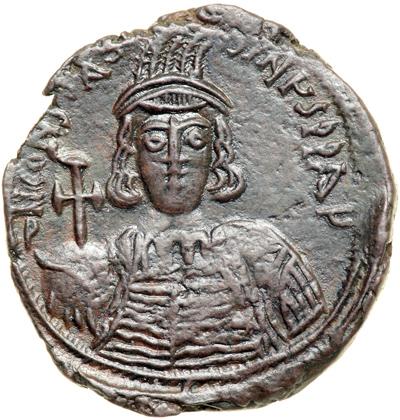Byzantine Empire. Constantine IV with Heraclius and Tiberius, 668-681. follis or 40 nummi (19.57g), Constantinople, 4th. officina, 668-73. Beardless bust facing, wearing helmet and cuir. and holding gl. cr. Rev. Large M between Heraclius and Tiberius stg. facing, each crowned and wearing chlamys and holding gl. cr. DOC 28d; MIB 77; Sear 1173. Extremely Fine with smooth brown patina, a splendid example of this celebrated revival of the heavy follis coinage of Justinian.