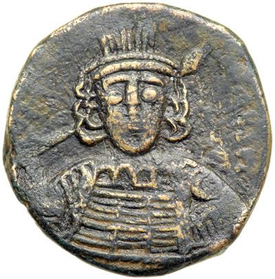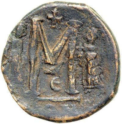 Byzantine Empire. Constantine IV with Heraclius and Tiberius, 668-681. follis or 40 nummi (19.89g), Constantinople, 5th. officina, 673. Beardless bust facing, wearing helmet and cuir. and holding spear diagonally over r. shoulder. Rev. Large M between Heraclius and Tiberius stg. facing, each crowned and wearing chlamys and holding gl. cr. DOC 29 var. (this officina not recorded); MIB 77; Sear 1174. Nearly Very Fine/fine.