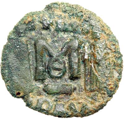 Byzantine Empire. Constantine IV with Heraclius and Tiberius, 668-681. follis or 40 nummi (3.52g), Ravenna, 681 (regnal. year 28). Helmeted and cuir. bust three-quarter face to r., with short beard, holding spear and shield. Rev. Large M between Heraclius and Tiberius stg. facing, each crowned and wearing chlamys and holding gl. cr., [ANNO] / [X]XVIII above, theta beneath, RAV in ex. DOC 86-91 var. (this date not recorded); MIB 117 (citing specimen in Museo Civico, Bologna); Sear 1239. Fine/good fine with rough green patina, very rare (possibly only the second known specimen with this date).