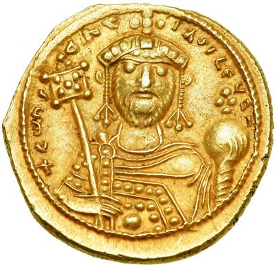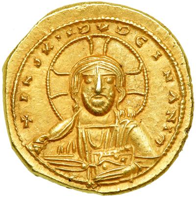 Byzantine Empire. Constantine IX, 1042-1055. GoldTetarteron Nomisma (4.07g), Constantinople. Bust of Christ facing, wearing nimbus cr. and holding book of Gospels, single border. Rev. Crowned bust of Constantine facing, wearing jeweled chlamys and holding labarum and gl. cr., the cross composed of four pellets, single border. DOC 6; Sear 1833. Choice Extremely Fine, an outstanding example of the lightweight gold denomination.