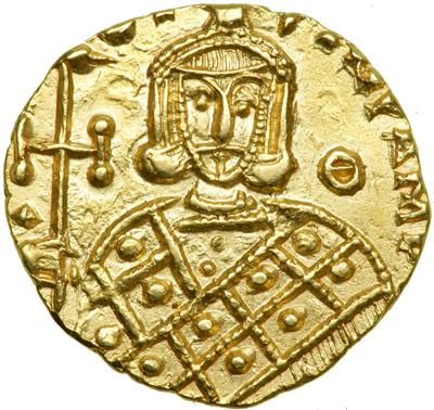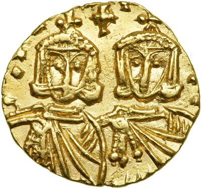 Byzantine Empire. Constantine V and Leo IV, 751-775. Gold Solidus (3.77g), Syracuse. 757-75. Similar to lot 2208, but of provincial style with theta in rev. field to r. DOC 15d; Sear 1565. Good Extremely Fine.