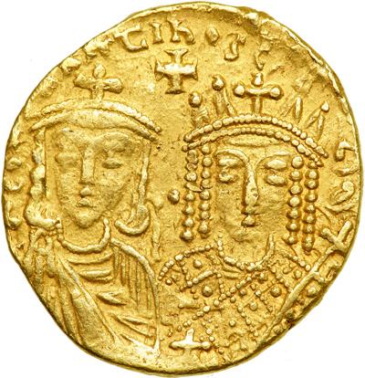 Byzantine Empire. Constantine VI and Irene, 780-797. Gold Solidus (4.41g), flan a little bent at edge. 790-92. [Inscription of Constantine], facing crowned busts of Constantine VI (on l.) and Irene (on r.), the emperor wearing chlamys and holding gl. cr., his mother wearing loros and holding gl. cr. and cruciform scepter, cross between their heads. Rev. [Inscription of Irene], the three deceased emperors Leo III, Constantine V, and Leo IV all seated facing each wearing crown and chlamys. DOC 2b var.; Sear 1591 var. Good Fine and rare, light gash across the three figures on reverse, a previously unrecorded variant with empress holding globus cruciger.