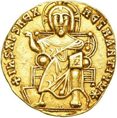 Byzantine Empire. Constantine VII and Romanus I, 920-944. Gold Solidus (4.36g), Constantinople. 920-21. Christ, with nimbus cr., seated facing on lyre-backed throne, holding book of Gospels. Rev. Facing crowned busts of Constantine VII, beardless, on l., and Romanus I, bearded, on r., each wearing loros and holding between them patriarchal cross. DOC 3; Sear 1741