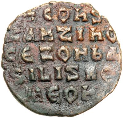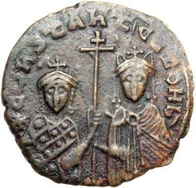 Byzantine Empire. Constantine VII and Zoe, 914-919. follis (5.66g), Constantinople. Facing crowned busts of Constantine VII and his mother, holding between them long patriarchal cross, the emperor wearing loros, the empress clad in chlamys. Rev. Imperial inscription in five lines across field. DOC 22; Sear 1758. Very Fine with brown patina, some light tooling.