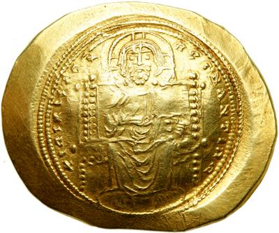 Byzantine Empire. Eudocia with Michael VII and Constantius, May-Dec. 1067. Gold Histamenon Nomisma (4.31g). Constantinople Christ, wearing nimbus cr., seated facing on square-backed throne, holding book of Gospels, double border. Rev. Crowned figure of Eudocia stg. facing between similar figures of her two sons, Michael on l., Constantius on r., the empress on footstool, wearing loros and holding jeweled scepter, the emperors similarly clad and each holding gl. cr. and akakia, double border. DOC 1; Sear 1857. Extremely Fine and rare.