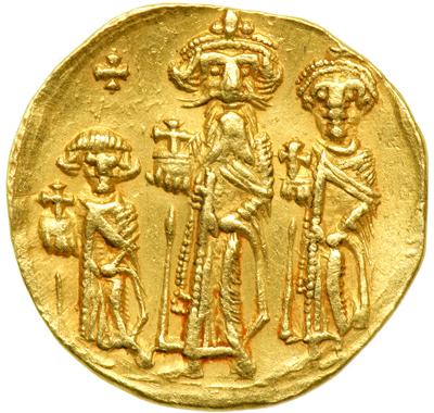 Byzantine Empire. Heraclius, Heraclius Constantine, and Heraclius Caesar 610-641. Gold Solidus (4.4g), Constantinople. , 5th officina 632-5. Facing stg. figures of Heraclius flanked by his two sons, all stg. facing and each holding gl. cr., Heraclonas (much smaller and uncrowned) on l., cross in field above his head. Rev. VICTORIA AVGU E, cross potent on three steps, Heraclian monogram in r. field, CONOB in ex. DOC 33c = Tolstoi 391; MIB 39; Sear 758. Very Fine.