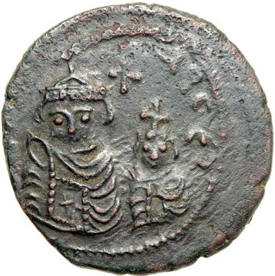Byzantine Empire. Heraclius and Heraclius Constantine, 613-632. follis or 40 nummi (12.42g), Seleucia Isauriae, 1st. officina, 616/17 (regnal year 7). Facing crowned busts of Heraclius, on l., and Heraclius Constantine, smaller, on r. Rev. Large M between ANNO and UII, Christogram above, SEL ISU in ex. DOC 180a; MIB 192; Sear 844. Good Very Fine with dark brown patina, an exceptionally fine example of this rare and interesting issue from this temporary mint.