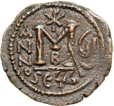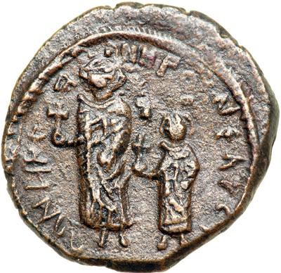 Byzantine Empire. Heraclius and Heraclius Constantine, 613-632. follis or 40 nummi (13.58g), Seleucia Isauriae, 2nd. officina, 616/17 (regnal year 7). Heraclius, on l., and Heraclius Constantine, on r., both stg. facing, each holding gl. cr. Rev. Large M between ANNO and UII, Christogram above, SEL ISU in ex. DOC 181b; MIB 193; Sear 845. Good Very Fine with brown patina, a handsomely struck example of this rare issue, traces of an undertype of Phocas.