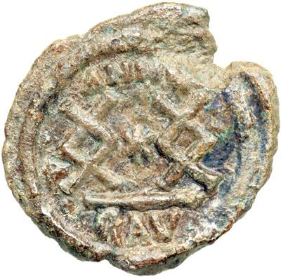 Byzantine Empire. Heraclius and Heraclius Constantine, 613-632. follis or 40 nummi (5.93g), Ravenna, 615/16 (regnal year. 6?). Crowned facing busts of Heraclius, bearded, on l., and Heraclius Constantine, beardless, on r. Rev. Large X X / X X with star at center, ANN UI (?) above, RAV in ex. DOC 285 = Tolstoi 285; MIB 249; Sear 911. Good Very Fine with nice olive green patina and extremely rare, possibly only the second known specimen (the other in Copenhagen).