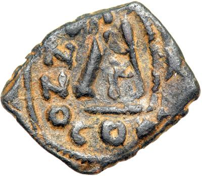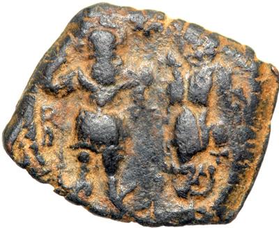 Byzantine Empire. Heraclius and Heraclius Constantine 613-632. three-quarter follis or 30 nummi (5.6g), Constantinople. 3rd officina, 629/30 (regnal year 20). Heraclius, in military attire, on l., and Heraclius Constantine, on r., both stg. facing, Heraclius holding long cross, his son holding gl. cr. Rev. Large lambda between ANNO and XX. DOC 117c; MIB 168a; Sear 812. Very Fine for the issue and with dark patina, carelessly overstruck as usual, a scarce denomination.