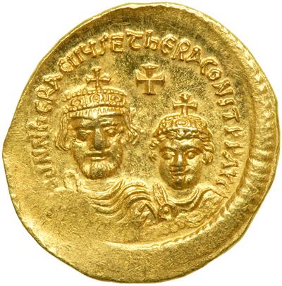 Byzantine Empire. Heraclius and Heraclius Constantine 610-641. Gold Solidus (4.47g), Constantinople, 6th officina. 613-16. Facing crowned busts of Heraclius, with short beard, on left, and Heraclius Constantine, much smaller, on right, cross between their heads. Rev. VICTORIA AVGU S, cross potent on three steps, CONOB beneath. DOC 8f; MIB 8a; Sear 734. Extremely Fine, some flatness on the senior emperor's bust.