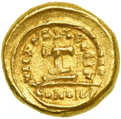 Byzantine Empire. Heraclius and Heraclius Constantine, 610-641. Gold Solidus (4.45g), Carthage, 13th indiction = 624/5. Similar to previous, but the rev. legend ends AVGG 1G. DOC 215; MIB 84a; Sear 867. Very Fine but double-struck.