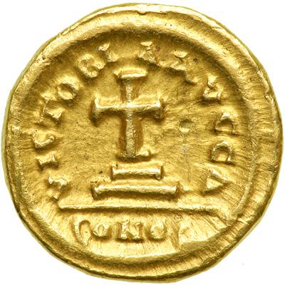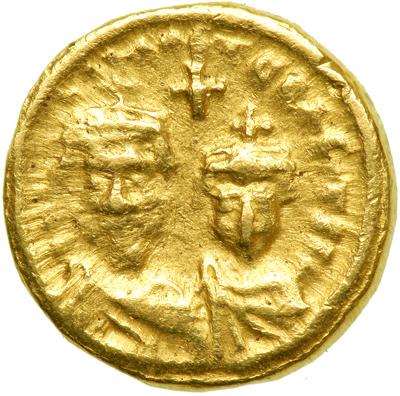 Byzantine Empire. Heraclius and Heraclius Constantine, 610-641. Gold Solidus (4.42g), Carthage, 4th indiction = 615/16. Facing crowned busts of Heraclius, with short beard, on left, and Heraclius Constantine, much smaller, on right, cross between their heads. Rev. VICTORIA AVGG D, cross potent on two steps, CONOB in ex. DOC 206; MIB 84a; Sear 867. Very Fine, obverse a little weakly struck.