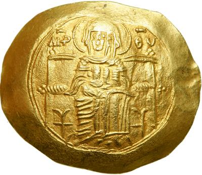 Byzantine Empire. Isaac II, First Reign, 1185-1195. Gold Hyperpyron Nomisma (4.17g), Constantinople. The Virgin, nimbate, seated facing on square-backed throne, holding before her circular medallion with the bust of the infant Christ. Rev. Facing stg. figures of Isaac, on l., and the archangel Michael, on r., holding between them sheathed sword, the emperor wearing crown, divitision and jeweled loros and holding cruciform scepter in r. hand, the archangel nimbate and in military attire. DOC 1b; Hendy pl. 20, 2-4; Sear 2001. Extremely Fine.