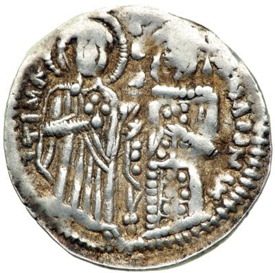 Byzantine Empire. John V and Anna of Savoy, 1341-1347. Silver Basilikon (1.21g), Constantinople. Coronation issue, 1341. Facing bust of Christ, wearing nimbus cr., his arms outstretched, above small half-figure of John V, crowned and wearing loros and holding labarum and gl. cr. Rev. St. Demetrius, nimbate, on l., and the deceased Andronicus III, crowned and wearing loros, on r., both stg. facing, the saint holding cross on breast. DOC 944; PCPC 199; LPC p. 120, 7; Sear-Bendall 2474. Very Fine and extremely rare, possibly only the fifth known specimen.