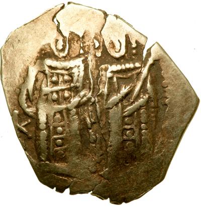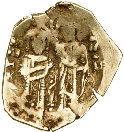 Byzantine Empire. John V and Anna of Savoy, 1341-1347. Gold Hyperpyron Nomisma (2.94g), Constantinople. The deceased Andronicus III, on l., kneeling before facing stg. figure of Christ, on r., who extends his r. hand over the emperor in benediction and holds book of Gospels in l. Rev. Anna of Savoy (on l.) and her son John V, on r., both crowned and stg. facing, the empress holding trefoil scepter, the emperor holding akakia and cruciform sceptre, sigla K in l. field. DOC 942-3 var.; PCPC 190 (sigla 4); LPC p. 116, 1; Sear-Bendall 2466. Fine/very fine and rare, poorly struck as usual and clipped.