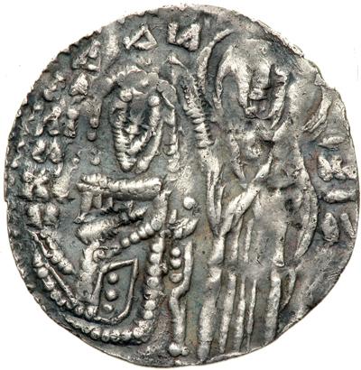 Byzantine Empire. John V and Anna of Savoy, 1341-1347. Silver Basilikon (1.01g), Constantinople. 1341/2. The deceased Andronicus III, on l., kneeling before facing stg. figure of the Virgin, nimbate, on r., who extends her r. hand over the emperor in blessing. Rev. Anna of Savoy (on l.) and her son John V, on r., both crowned and stg. facing, the empress holding trefoil scepter, the emperor holding akakia and cruciform sceptre. DOC 945-53; PCPC 200; LPC p. 122, 8; Sear-Bendall 2475. Fine and rare.