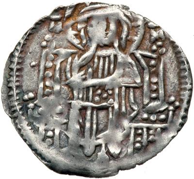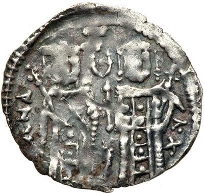Byzantine Empire. John V and Anna of Savoy, 1341-1347. Silver Basilikon (0.95g), Constantinople. 1342-5. Christ seated facing on high-backed throne, wearing nimbus cr. and holding book of Gospels. Rev. Anna and John stg., as previous. DOC 966ff.; PCPC 277; LPC p. 132, 2; Sear-Bendall 2503. Very Fine and rare, areas of flatness.