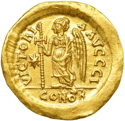 Byzantine Empire. Justin I, 518-527. Gold Solidus (4.09g), Constantinople, 10th officina. Helmeted and cuir. bust three-quarter face to r., holding spear and shield. Rev. VICTORIA AVGGG I, Victory stg. l., holding long P-headed cross, star to l., CONOB in ex. DOC 1h; MIB 2; Sear 55. Nearly Extremely Fine but of unusually low weight.
