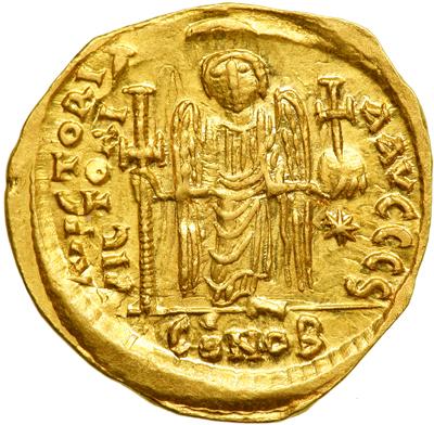 Byzantine Empire. Justin I and Justinian I, 527. Gold Solidus (4.49g), Constantinople, 6th officina. D N IVSTIN ET IVSTINI PP AVG, the two emperors, both nimbate, enthroned facing, each holding globe in l. hand, their l. knees advanced, cross between their hds., CONOB in ex. Rev. VICTORIA AVGGG S, angel facing, holding long cross and gl. cr., star to r., CONOB in ex. Cf. DOC 8 (officina not recorded); MIB 1d; Sear 124. Extremely Fine and rare, double-struck on both sides.
