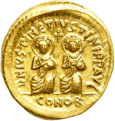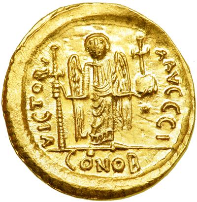 Byzantine Empire. Justin I and Justinian I, 527. Gold Solidus (4.48g), Constantinople, 10th officina. All as previous, but with officina mark I at end of rev. legend. DOC 8c = Ratto 437; MIB 1d; Sear 124. Virtually Mint State, an outstanding example of this rare coinage.